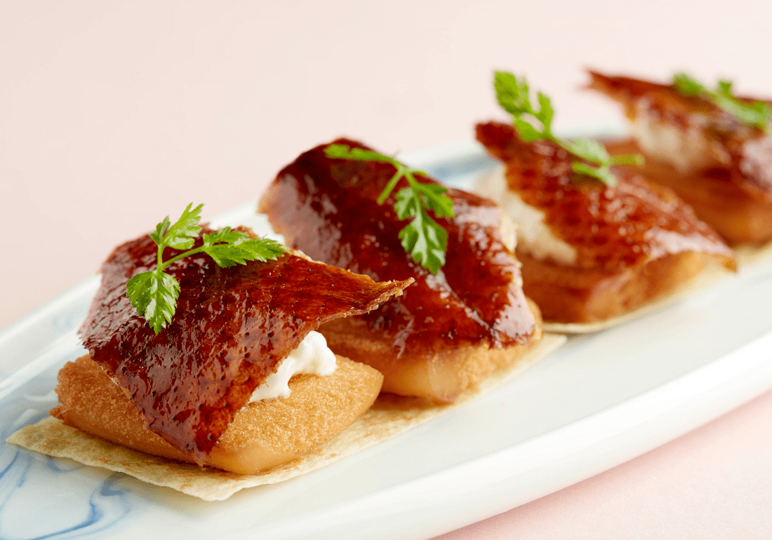 There’s the Sliced Peking Duck with Crackers (S$4.80++ each, minimum four per order) and Mini Burger with Peking Duck Salad (S$4.80++ each, minimum four per order). Both deliver bite-sized portions of duck skin, but going carb-heavy on buns in the latter makes for a lower ratio of duck to other ingredient, so we definitely preferred the former.