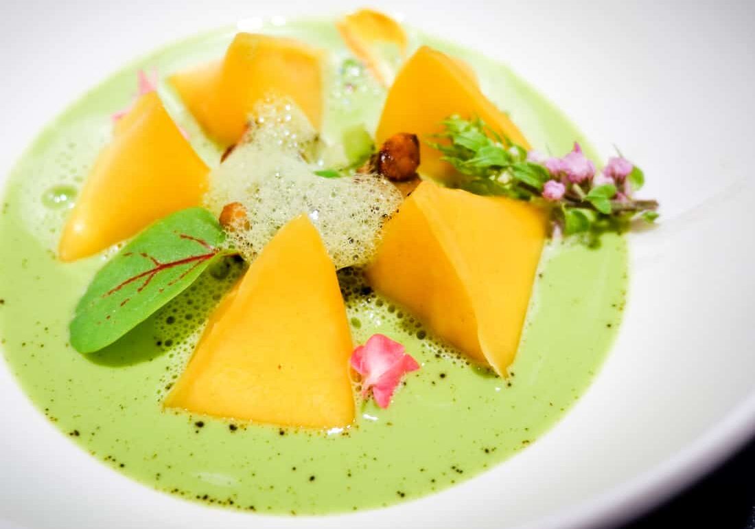 Taking the fusional flair up a notch, The Blue Lobster from Brittany is an inspired medley of three cuisines. The broth here mixes up three liquids you’d never think to mix: crustacean bisque, genmaicha, and Madras curry. Yet somehow, it works – the umami stock of blue lobster shell, deepened by the roasty genmaicha and rich curry spice, blends into a deep and almost coffee-like concoction. Floating in the bisque is a yuzu-infused bed of koshihikari rice, laid with the dish’s crown jewel: blue lobster seared over binchotan to smoky perfection.
