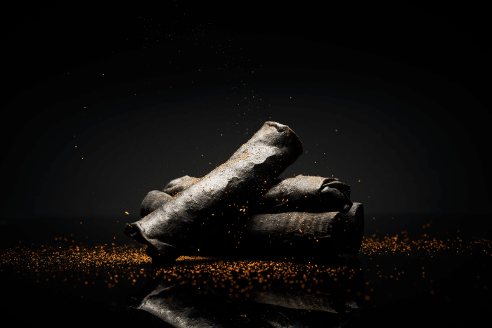 If there’s one dish you should order, it is the Edible Charcoal ($23), a long black roll with Angus beef short ribs that’s been cooked in sweet Saikyo miso and port wine for 16 hours, rolled in a spring roll, coated in fine bamboo charcoal, and then deep fried. Crisp and delicious. There are other meat dishes, like the Char-Pork Jowl ($35), marinated with dried chilli and curry powder, confit in duck fat, grilled on the binchōtan, and topped with a tart curry cream sauce prepared with mashed green apples.