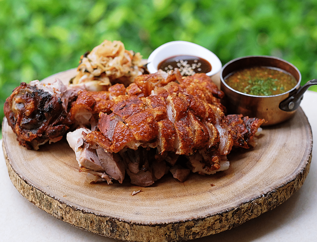 For a more substantial dish, the German Style Crispy Pork Knuckle (half portion $26; full portion $36) did not disappoint. The skin was roasted to a crispy crackling exterior while the meat remained deliciously tender. Choose to dip it in the sweet and thick Peking-style Hoisin Sauce or the Thai Nam Jim sauce; we hear the latter can be spiced up to cater to diners with different palates. The Scallion Soy Barramundi ($26) was another hit at the table with its fresh, firm, and flaky barramundi flesh. The sautéed Hong Kong choy sum was a little overcooked but the shimeiji mushrooms, asparagus, and carrots were nicely done. Rice is a must for this dish to soak up all that sauce in the claypot.