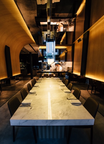 You enter the doors into a relatively narrow restaurant decked in sleek warm light, with a long 12-seater marble table smack in the middle. Like Sun Kim’s first concept, the space is decked out in mirrors to provide the illusion of size, and even the open kitchen isn’t spared.