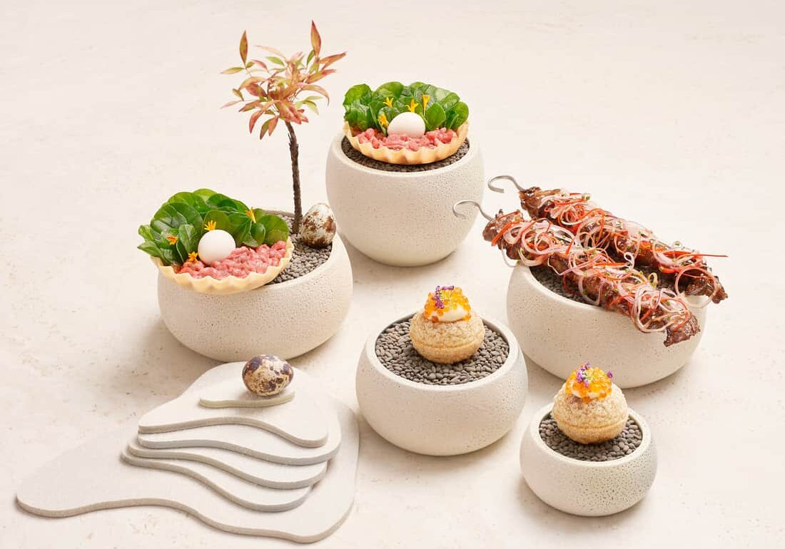 Set in Marina Bay Financial Centre, the space lives up to the name: an all-white dreamscape that swirls with layered waves and curves, recalling the contours of a topographic map. Fluted columns draped with vines, plush leather chairs, and gold accents complete the dreamy effect. Peek into the spacious kitchen, visible behind full-glass doors, and you’ll spot a secret corner with an emerald booth seat: the chef’s table. Here, guests can get a private omakase experience with front-row views of the chefs at work.