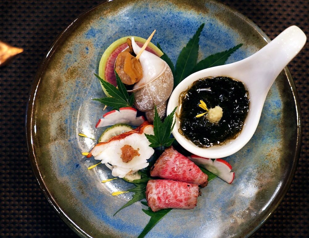 Next up, we get the sea in bowl – layers of Hokkaido scallop, sea urchin, Kaluga caviar, and a sparkly piece of gold leaf for good measure. Creamy, briny, and umami; there’s nothing to complain about here, and the portion for this much richness and extravagance is just right. Chef Shigeru then resets the palate for us with a cold plate of Japanese fruit tomato and tosazu (marinade of bonito dashi) jelly, which keeps things on the savoury track with a topping of uni and a dab of caviar.