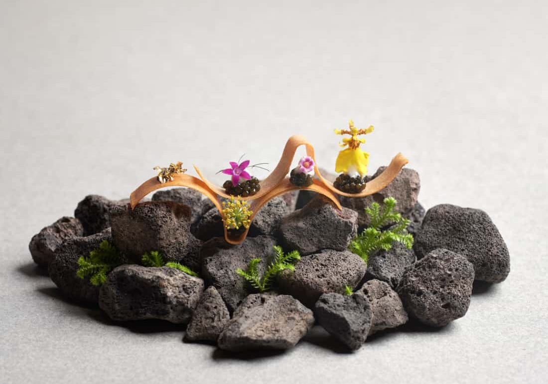 The lush experience begins the moment you step through the door and down a pebbled garden path. Crafted by JTAW Design – the culinary design studio founded by chef Jason with his partner, Arissa Wang – the space is an abstract dream of an indoor garden. Natural materials take centre stage, from the stone tabletops and undulating concrete walls to the plants sprouting from the ceiling. And in homage to his favourite vegetable, the Cévennes onion, abstract onion shapes curve everywhere. Overhead, a light fixture uncoils across the ceiling in gleaming brass layers, like so much onion peel.