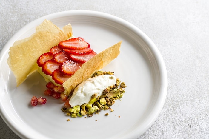The strawberry Baklava ($14) is unlike the traditional Central Asian version made of heavy sweet dough. Served with a dense block of organic leatherwood honey that melts into an aromatic, light creaminess in the mouth, the two layers of delicate filo pastry adds a delightful crisp. The tangy yogurt brings out both the tartness of fresh strawberries and the sweetness of honey – be sure to dig in from top to bottom to get all the flavours on your spoon.