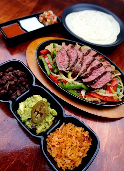 I ambitiously order a Ribeye Steak Fajita Platter ($32), which on hindsight, is enough to feed two. The marinated and grilled ribeye is served on top of a sizzling mound of onions and pepper that’s been charred. There are the various dips and condiments that you stack on a warm flour tortilla: fresh guac, pico de gallo, a herby cilantro lime crema, black beans, fluffy Mexican rice, and Sid’s special hot sauce – which really widens the eyes. The fun lies in rolling up these pockets of yum yourself.