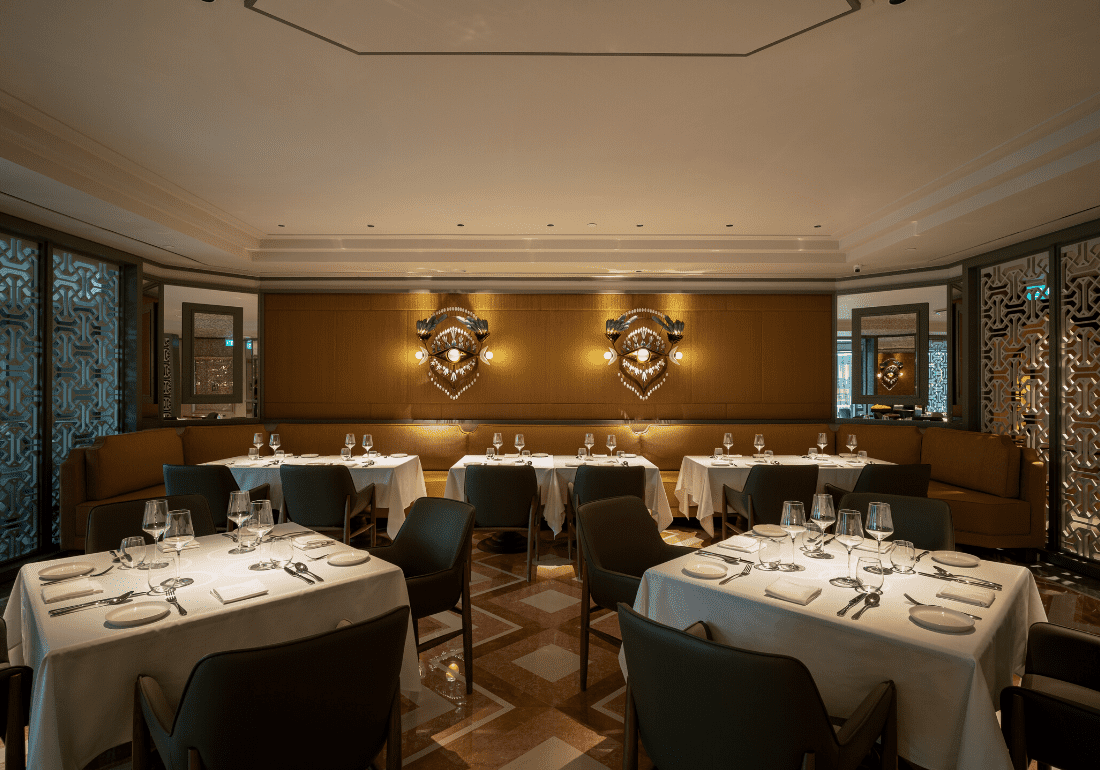 Behind unassuming doors, the restaurant’s ground floor space opens up to gorgeous paintings adorning stunning traditional-inspired interiors, with passageways leading to five different dining areas – each designed to take you on a journey through India’s deep history and varied cultures. We settled in the Jaipur dining hall, with rich silk wallpaper carrying specially designed wall-lamps that resembled the eyes of an elephant.