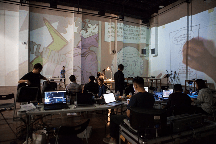 It starts off with a Frank Sinatra groove (named Sunny, of course), as Koh’s character launches into a pre-recorded interview with Sonny – about his Eisner win, his family, and his childhood. Meanwhile, the cartoonist sets to work on his fictional comic book, titled Black Oyster, which is projected on the walls of the room. In between, you are cut off and introduced to his story’s protagonist Henry, the superhero Green Bolt by night, filial son of an ailing mother by day.