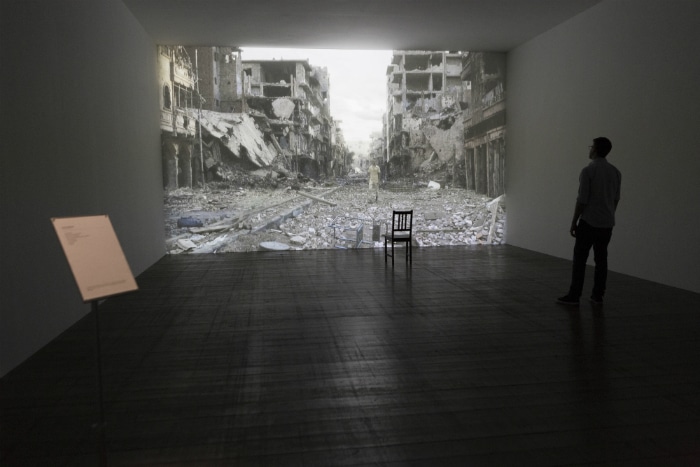 Entering the installation, you’re greeted first with the familiar white cube of a gallery space. A larger-than-life projection of a war-torn scene lies straight ahead, covering an entire wall, but it is easy to ignore for the more curious objects that exist in the exhibition space with you – a toppled chair and a stand. The text on the latter announces the mediums used in the installation: an overhead projector, internet connection, two chairs, two people. Hold on, there’s only one chair in that space, and you’re the only one here. It is then, and only then, that you begin to notice the uncanny.