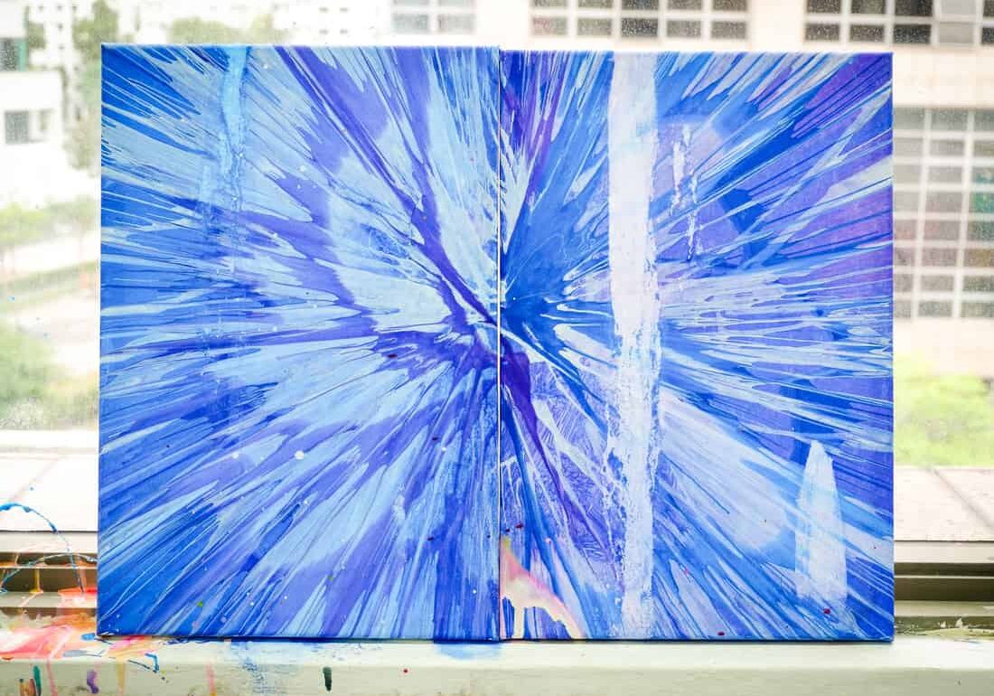 From there, it was a short step to spraying thick streaks of paint and letting kinetic energy whirl them into splashes of colour. Once we let our vision of the ‘perfect’ masterpiece fly out the window, things got a whole lot more fun. As a finishing touch, we squirted a rainbow of colours into the trapeze, and let it splatter randomly over the canvas.