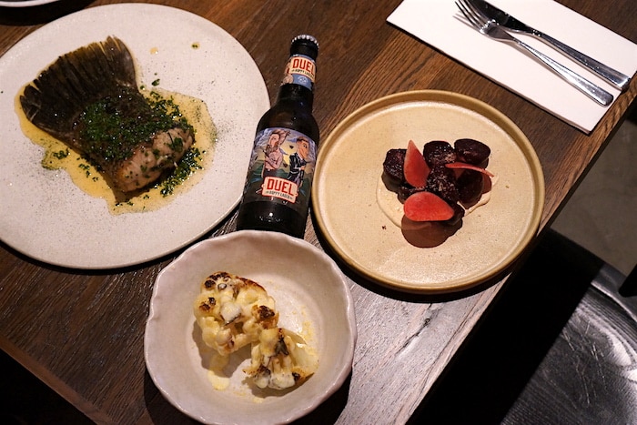 After all that meat, things lighten up a little with the grilled Cauliflower with a sprinkling of malt vinegar and onion salt, roasted Beetroot on hazelnut horseradish, and Barramundi Fish Tail grilled on the Josper with prawn butter, topped with wakame and chives. Stockade’s Duel Hoppy Lager turns its head on the traditional lager with a hopped-up experience with a rich tropical nose and a crisp finish, which complemented the trio, in particular the flavoursome fish tail!
