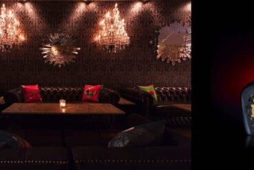 Royal purple seats with jewel-tone cushions and colourful low velvet stools in the VIP area; regal wallpaper and dark brown...