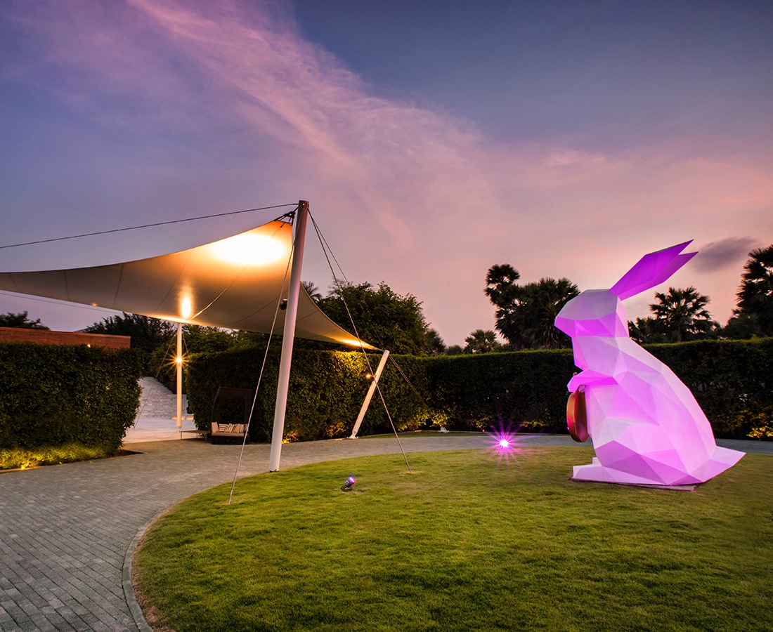 a photo of the entrance of so sofitel hua hin, thailand, a rabbit lawn.