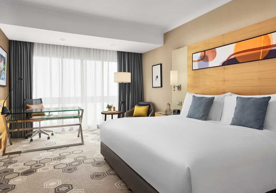 Guests of the old Hilton will find the hotel’s 423 rooms largely familiar, barring a few decorative additions. Our King Bed Premium Room (from S$231.35++) is a spacious 32 square metres, set high on levels 17 to 19. Blonde wood and grey carpeting make for a sleek, bright space, though our view out the full-length window is mostly limited to high-rise residences.