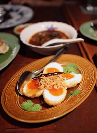 The five sharing mains are presented all at once – with rice to go along, of course – like in all Thai restaurants. Standouts of this course are definitely the “Son in Law” Eggs, where the yolks of the fried medium-boiled eggs served with three-flavour sauce and fried shallots have a wonderful semi-cured texture, the Moo Cha Muang, tender pork stewed with Thai herbs and cha muang leaves, and the Yum Pla Salid.