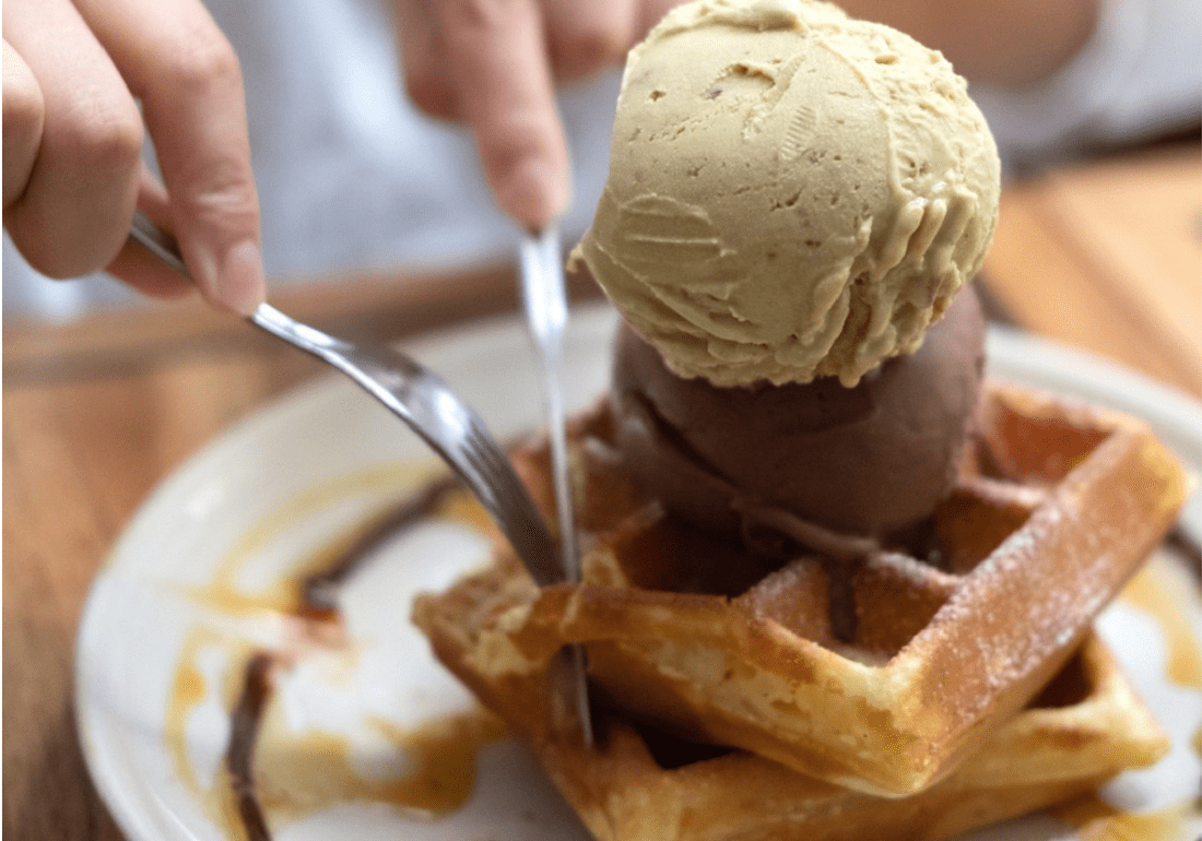 The long-time resident of Chip Bee Gardens in Holland Village delivers a carefully curated menu of distinctive sweets and cakes as well as freshly churned ice cream that is handcrafted in small batches with great attention to detail. The ice cream pairs perfectly with the cafe’s signature Belgian waffles, made with locally sourced market fresh eggs and 100% pure butter. Get a waffle with a single scoop ($11.80++), double scoops (add $2.80++), or craft your own waffle creation with different topping options ($1.90++ per serving).