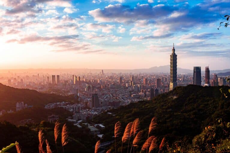 Stunning panorama of Taipei skyline including Taipei 101 viewed from Elephant Mountain under a vibrant sunset sky.