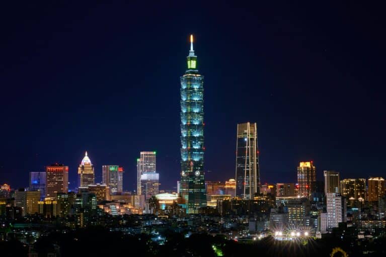 Free Illuminated Taipei 101 and city skyline at night showcasing modern urban architecture. Stock Photo