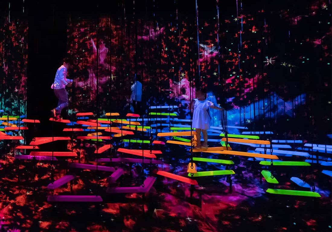 Drawing inspiration from the murmuration of flying birds, the next installation takes visitors to the skies! Aerial Climbing Through a Flock of Colored Birds invites visitors to take flight by walking on air. Every step you take on the floating lighted bars projects a pattern of sound, light, and colour, so you co-create this artwork with others as you move through this highly-immersive space. It’s relatively easy to move through the aerial structure, but visitors should note that covered and flat footwear are essential for the safe enjoyment of this installation.