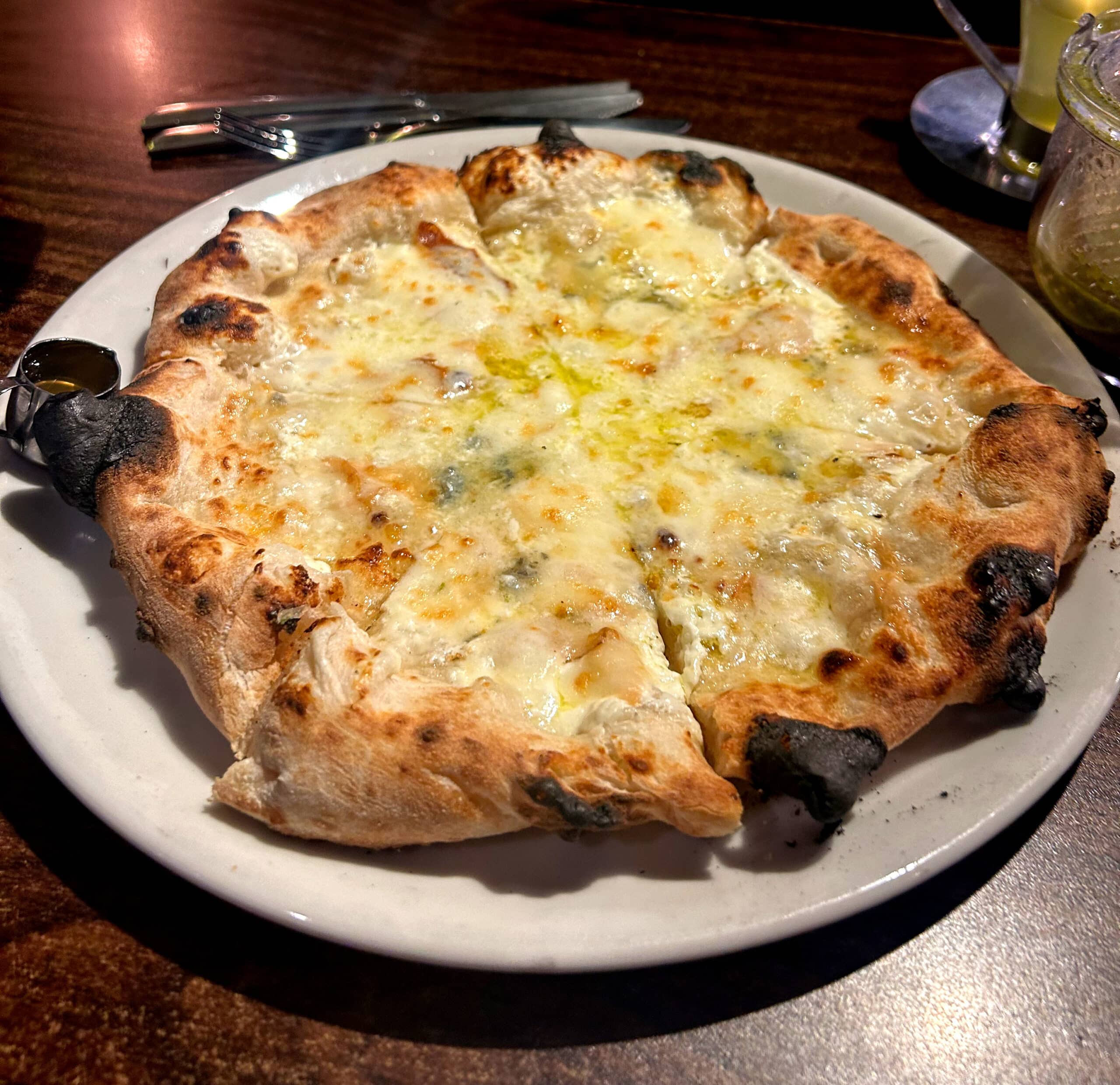 Toppings: Fresh smoked mozzarella, Gorgonola, Taleggio, Grana Padano, Mascarpone, with honey