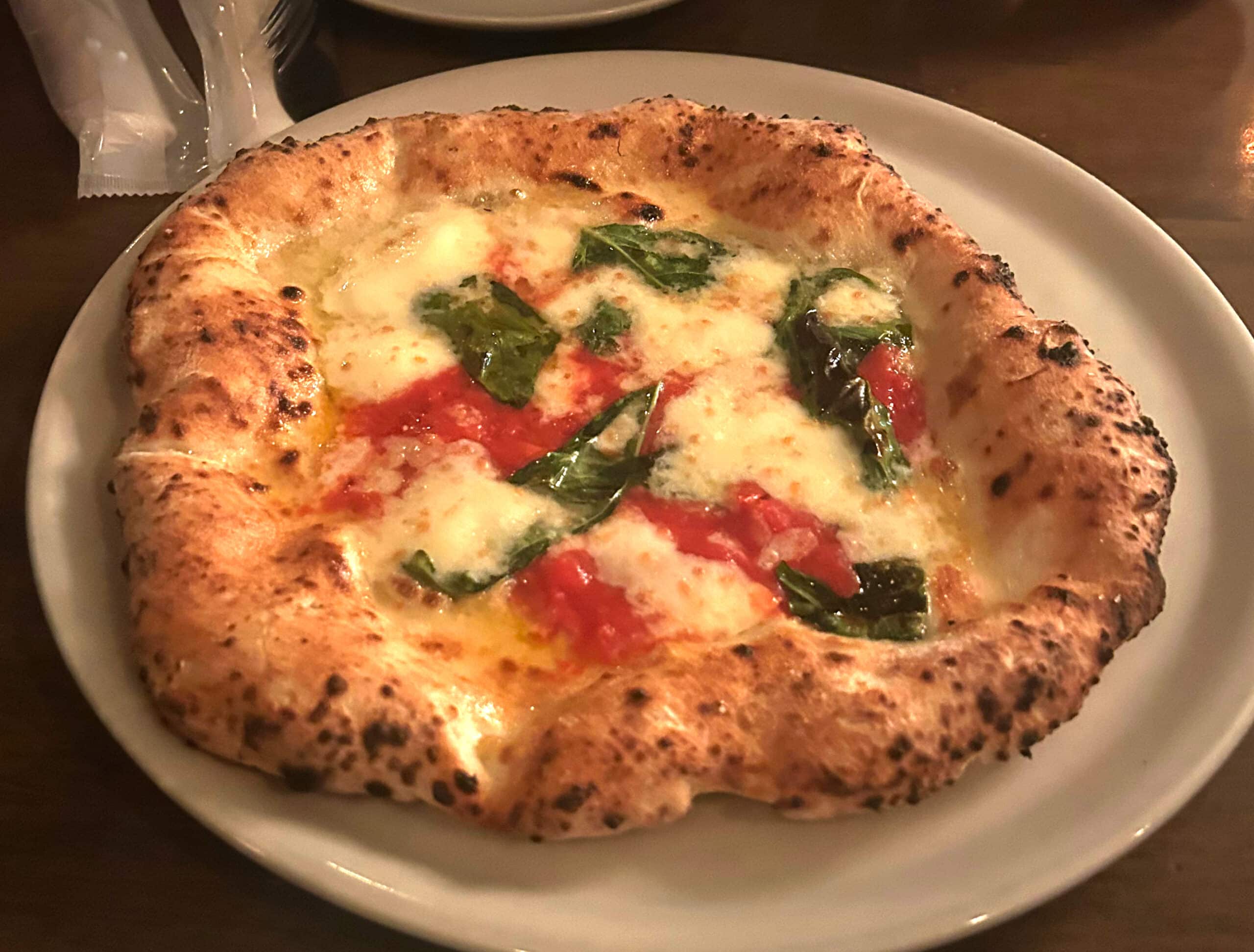 Topped with fresh, high-quality mozzarella and a few fragrant leaves of basil, the pizza arrived with a crust that was softer, chewier, and almost cloud-like in its airiness. Puffy with a tender mouthfeel and a slow-building saltiness, the dough brought warmth and softness that beautifully balanced the boldness of the sauce. The interplay between the deep tomato base, the creamy mozzarella, the fragrant basil, and the tender crust elevated this pizza into what could be considered a very fine pizza.