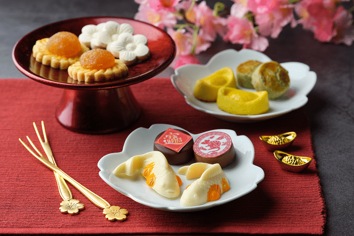 At The Boutique at 15 Stamford, festive takeaways take shape in the form of mouthwatering coffee table favourites – think Green Pea Cookies (S$22+), Kuih Bangkit (S$25+) and Prawn Rolls (S$15+). Looking for a centrepiece? Look no further for yet another rendition of the Mahjong Set Chocolate Palines (S$38+), or make your New Year gift stand out from the rest with The Boutique’s Lunar New Year Hamper (S$298+), filled with Astrolabe red wine, housemade pineapple tarts, South African abalone, 90 Day Organic Premium Grade Rice, and more.