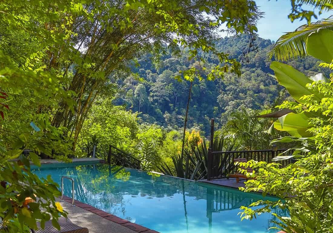 The Shorea offers a verdant escape with villas perched atop the hill. Separated into two wings, the air-conditioned duplex villas with private dining found at The Shorea ESTATE, while villas at The Shorea RESORT are naturally ventilated with communal dining facilities. Besides swimming in the infinity pools with views overlooking the lush rainforest, guests can play board games and unwind with in-house massages. Take guided walks along the Batang Benar River, which ends at a waterfall where you can cool off.