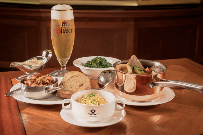 Then choose a main from a selection of Szegediner GoulashGrillhendlCordon Bleu, or the all-time favourite Wiener Schnizel, a tender veal cutlet fried to golden perfection and served with traditional Austrian potato salad. End the meal the classic Austrian way: with a good helping of Apple Strudel, the world-famous chocolate Sachertorte, or the Kaiserhaus Raspberry Truffle Cake.