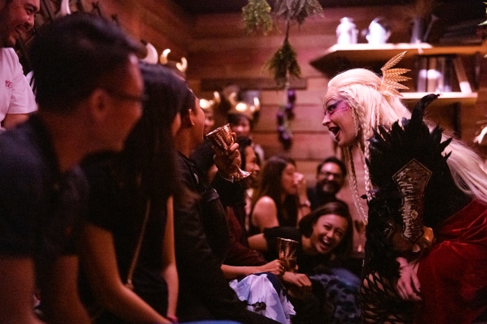 Like all other ANDSOFORTH’s productions, our arrival is prearranged at a secret location according to our tickets, and we have to say it really sets up the mood. The dress code is “Vikings, Valkyries, and Village folk”. We start at the rainbow-hued Bifrost Bar, where we’re welcomed with a tasty Highland Park whisky cocktail. You’ll take on the role of a viking or a shield maiden before travelling through seven different rooms all while participating in a series of trials, think a merry viking folk song singalong or grinding up ancient herbs and spices to create a lethal potion (possibly containing alcohol) — intended for who, we can’t say. If you play ball and complete the trials, you might just ascend into Valhalla, the heaven-equivalent of Norse legends.