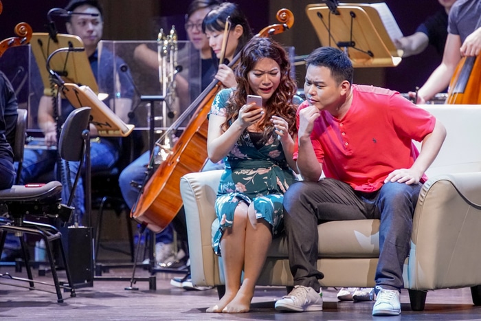 Taiwanese bass Ming-Mou Hsieh sings the titular role. His is an exceptionally likable Don Pasquale, even when spouting money-minded prejudices that Singaporeans might find uncannily familiar: “Rich marry poor become poor!” In the arias, his rich tones are unfortunately drowned out by the orchestra at many points. This Taiwanese singer handles his Singlish splendidly, however, whether it’s despairing “buay tahan ah!” or squawking “贱女人!” (an impolite Mandarin term for a floozy). It’s a local flavour of Don Pasquale’s materialism that’s highly recognizable – think your jolly, bigoted grandfather whom you still love.