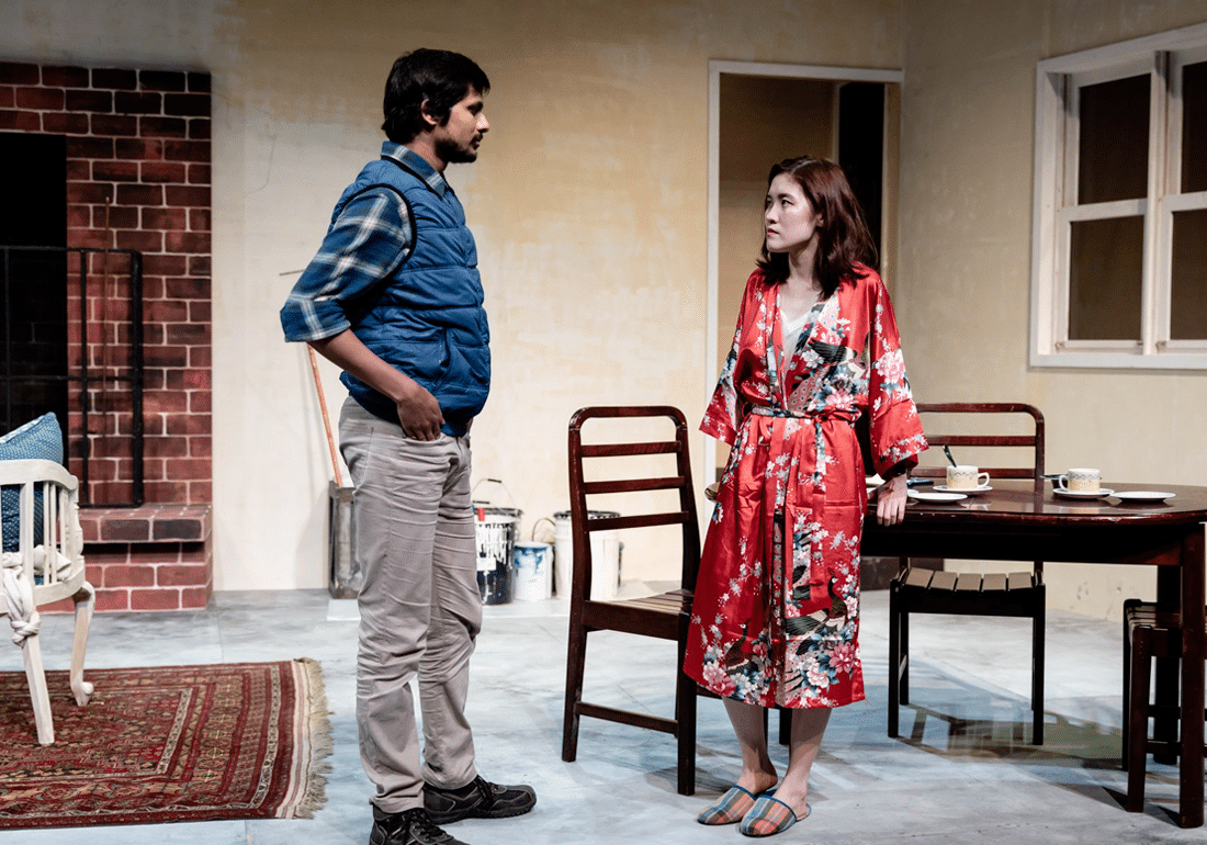 Marjorie, who’s played by Hau Guei Sze (Zizi), lazes around home in a nightdress and red robe after her housemates have left for work. Dorothy Ng’s set is relatively simple, but more than adequate in showing a comfortable flat shared by three young women at the start of their careers. Well, two of them anyway. After getting stung by a wasp, Marjorie stumbles and leaves the door unlocked by accident. Of course, Raul (Lakshmana KP) has to let himself in and ask for a Joe. After Marjorie asks him to leave — “There’s no Joe here” — he tries to use the phone… by pulling out the cord.