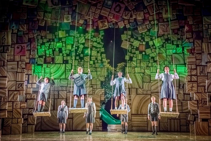 Rob Howell’s set design is a floor-to-ceiling wonderland of Scrabble-like tiles and bookcases, bringing to life the mind a young girl. Later, there are wooden swings suspended from the ceiling, and during ’School Song’, a thrilling sequence that sees blocks shoved through the school gates to form the letters of the alphabet. It suggests an affinity for words, which makes sentences, which make stories — the entire theme that Matilda revolves around.
