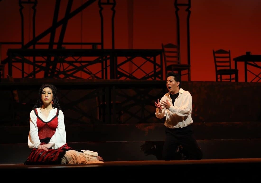 Instead, it is the cocky heartthrob Escamillo, played by baritone powerhouse Martin Ng, whose chemistry with Carmen truly sizzles. With strong rugged eyebrows and a delicious swagger, Ng’s Escamillo easily dominates the stage. He delivers the Toreador Song in a suitably brawny timbre, while finding softer tones to harmonise poignantly with Weng in their Act IV love duet (Si tu m’aimes, Carmen). It’s the last tender moment of the opera, before the terrible violence of her confrontation with Don José.