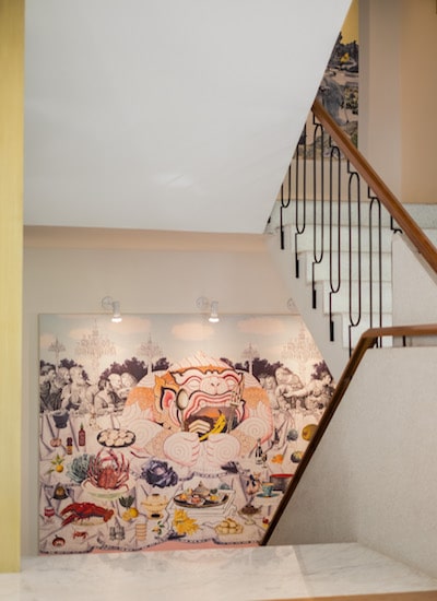 Take the stairs on your way down from the room and you’ll notice the artwork in the stairwell. Again, it’s the fusion of traditional and new with Thai temples in the background of Western children and families frolicking. If you love cats, try to spot the hidden cat in each collage. A great reward for taking the stairs instead of the elevantor, we think.
