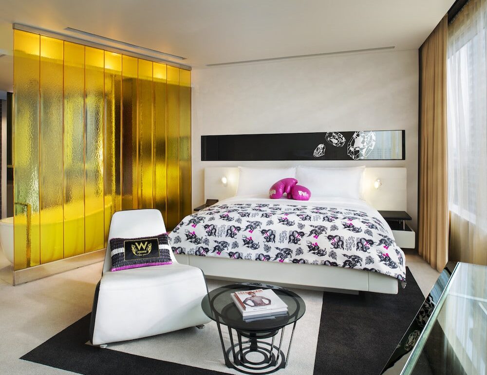 Speaking of rooms, our Spectacular Room was essentially 43 square metres (462 square feet) of triangular space anchored by the gleaming free-standing tub – separate bathroom and shower facilities included – behind the coloured-glass panel separator, the king-sized W Signature Bed, and a glass work desk that looks out to the city. The windows are not exactly floor-to-ceiling but they still let in plenty of natural light. The mainly monochromatic room is accented with abstract art and playful props like the Muay Thai glove cushions on the bed for pops of colour.