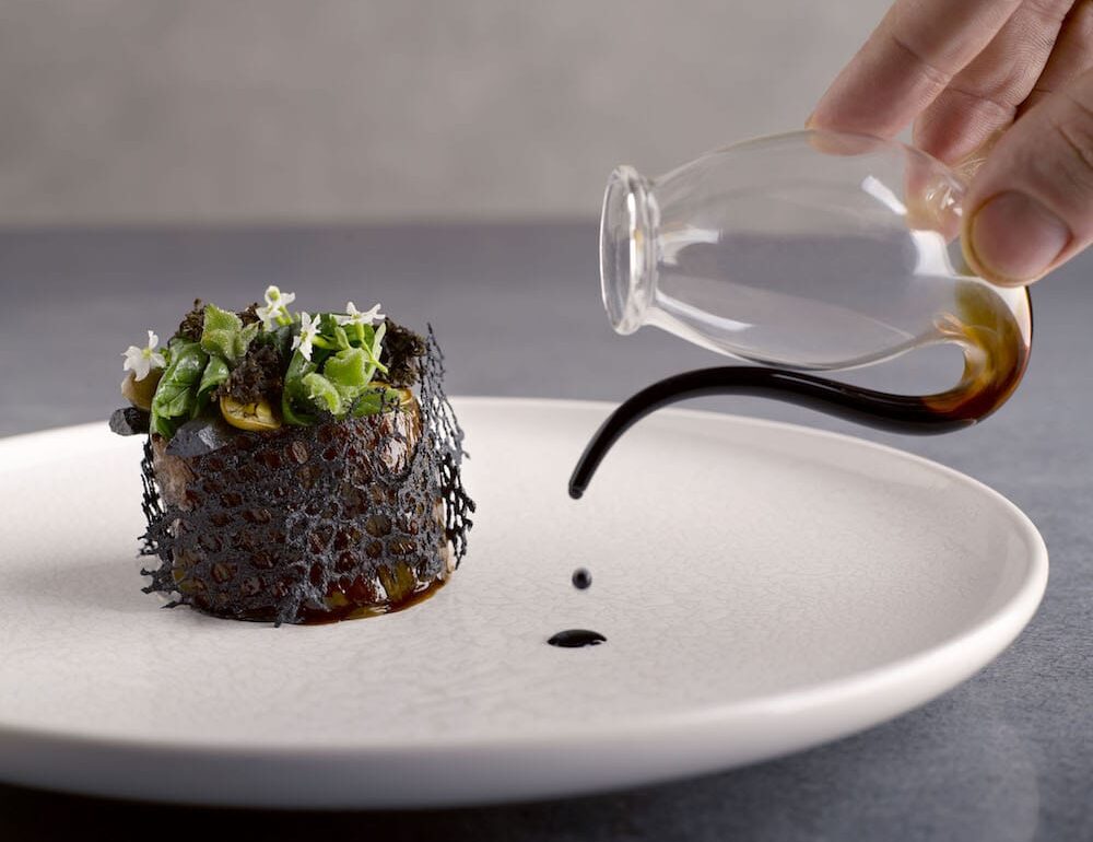 He had us at his black moss-encased, salt-brined pork – so fatty it’s almost porcine gold. House-made tofu and ribbons of scallop pale somewhat in terms of flavour, salvaged by a pork broth that goes bone-deep on comforting umami. While the charcoal-grilled beef is slightly gummy for a tenderloin, there is no denying the fitting accompaniments of fermented mushroom puree and a drop of 20-year aged soy are extremely well-played, harbouring an intensity that is both outrageous and plain delicious.